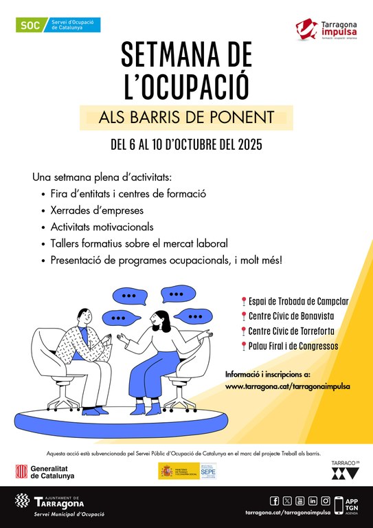 El proper dilluns 6 d'octubre està previst l'inici de la I Setmana de l’Ocupació als Barris de Ponent que se celebrarà des de dilluns fins el dijous 9 d’octubre. Per primer cop, diferents espais de Campclar, Bonavista i Torreforta acolliran diverses activitats per tal d’apropar a la ciutadania d’aquests barris els recursos d’ocupació, formació i orientació professional de Tarragona Impulsa.
